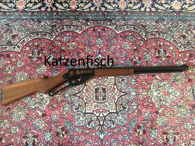 Die Schrauben und Muttern sind original. Das wurde ab Werk so gebaut. ACHTUNG WICHTIG: Solange noch kein Gebot vorliegt bzw. über Sofortkauf abgeschlossen wurde, behalte ich mir vor, die Auktion vorzeitig zu beenden. Ich bitte um Verständnis! KEIN VERKAUF AN BIETER MIT NULL BEWERTUNGEN!!!! und ich verkaufe auch nicht ins Ausland!!! Diese Gebote werden gestrichen! Allen anderen wünsche ich viel Glück! Wegen Sammlungsauflösung: Seltenes Daisy 1938 B Lever-Action Luftgewehr Buffalo Bill mit tollem Holzschaft. Die Ausführung Buffalo Bill gab es nach meinen Recherchen nie in den USA und war nur für den Export gedacht. Produziert wurde es von 1980-85. Es hat auch keinen billigen Lackschaft wie das Red Ryder. Der Systemkasten besteht aus Stahlblech. Natürlich hat das Gewehr den F-Stempel. Es gibt sogar eine Abzugsicherung. Geladen wird es mit Stahl BB´s Kaliber 4,5mm. Innen arbeitet ein ganz herkömmlicher Kolbenmechanismus, es wird also kein Co2 benötigt. Gespannt wird der Kolben über den Lever-Action Bügel und auch gleichzeitig die Kugel transportiert. Dazu wird vorne am Lauf ein Schieber zur Seite geschoben und die BB´s eingefüllt. Das Gewehr funktioniert einwandfrei. Der Schieber von der Kimme ist eine Nachfertigung, aber sehr gut gemacht und funktioniert einwandfrei. Sieht man nur, wenn man es weiss. Der Zustand ist in Anbetracht des Alters wirklich klasse. Selbst hinten am Schaft gibt es nicht die üblichen Gebrauchsspuren, wenn es hingestellt wird. Auch das Holz hat keine Risse. Ein richtig schönes Sammlerstück, nicht zu verwechseln mit dem Red Ryder Gewehr, das es ja auch heute noch gibt. Die Buffalo Bill wird eigentlich nie angeboten, sie befinden sich alle in festen Sammlerhänden. Wie immer verkaufe ich trotzdem einfach mit Gebrauchsspuren.