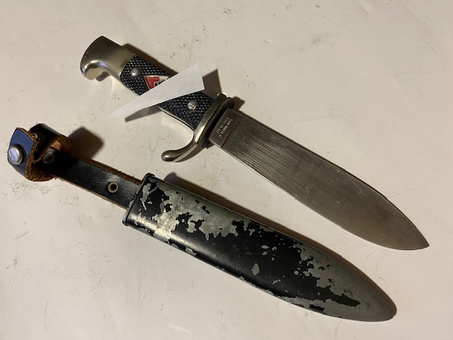 1 Messer HJ mit Raute - Scheide berieben; sonst in sehr gutem gebrauchten Zustand - Weitere Fotos auf Anfrage - Paketversand 9,90 Euro mit DHL in der BRD - Bei unversichertem Versand übernehme ich keinerlei Gewährleistung. Bei Geboten auf weitere Artikel Unkosten erfragen. Unklarheiten vorher klären und nicht hinterher beschweren. Mit Abgabe des Gebotes akzeptieren Sie die angegebenen Versand und Unkosten sowie die Verkaufsbedingungen.