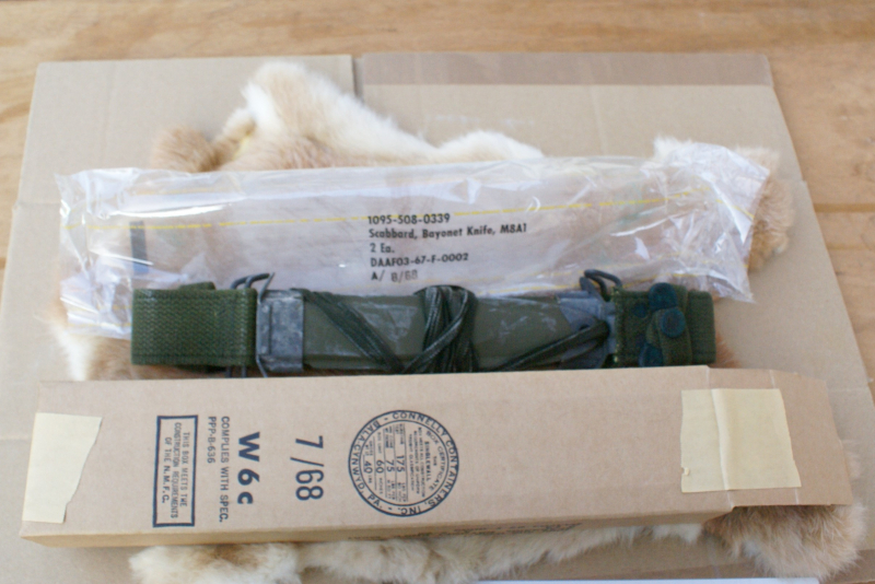 Ein ORIGINAL! 2er Set Messerscheiden M8A1 fabrikneu und im Originalkarton aus alten Lagerbeständen. So wahrscheinlich nicht mehr zu finden. Laut Aufdruck auf dem Karton wohl von 1968. Der Karton wurde von mir vorsichtig geöffnet um den Inhalt zu überprüfen. Die Folienhülle war original offen.