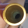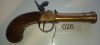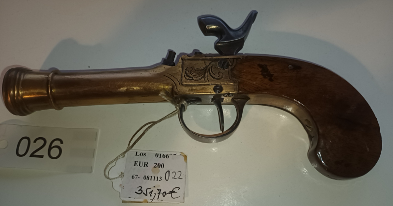sie bieten auf eine schöne original Perkussionspistole (026) mit Messingkasten und Messinglauf. Der Lauf öffnet vorne etwas tromblonförmig. Aussendurchmesser 28 mm, innendurchmesser 16mm an der Mündung. Sie verjüngt sich stark, so das es Kal.45 sein kann. Die Feder ist OK und und technisch in Ordnung. Der Lauf hat Durchgang zum Piston. Das Messing und das Holz hat keine Sprünge oder Risse. Die Stahlteile sind in einen überarbeiteten Zustand ohne Rostnarben. Der Griff ist schlicht aber ohne Beschädigungen. Die Pistole ist kannp 200mm lang und insgesamt in einem guten gebrauchten Zustand. Es ist eine hübsche Waffe ohne wesentliche Mängel.