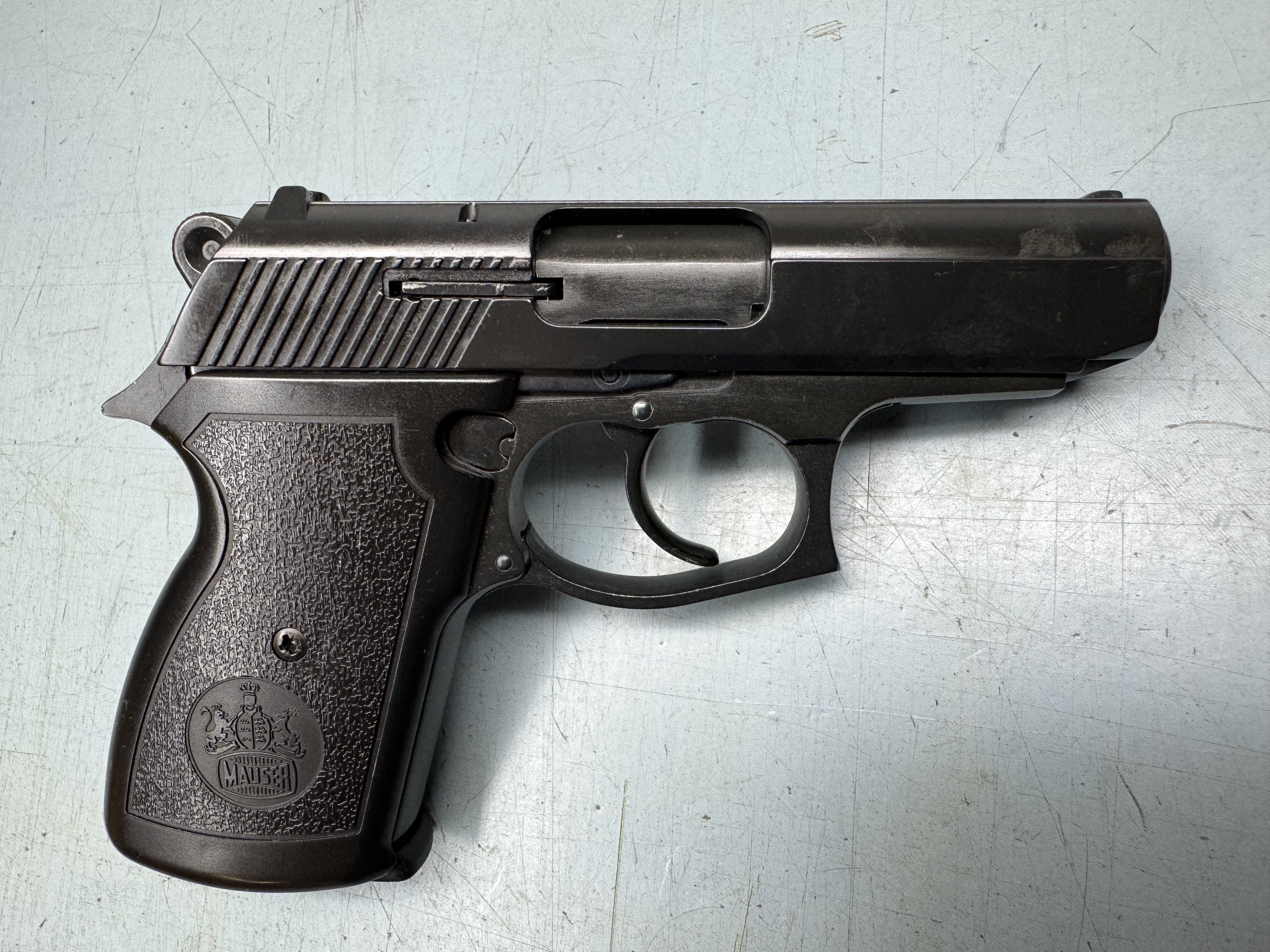 Ich biete euch hier meine Schreckschuss Pistole Mauser HSc Mod. 90, 9mm P.A.K. in brünierter Ausführung an, hier mit der PTB 722. Die Mauser HSc Mod. 90 ist bis auf wenige Teile baugleich mit der Röhm rg 88 und wurde natürlich auch von Röhm produziert. Sie kommt mit Zubehör wie Kurzwaffenkoffer, Bedienungsanleitung, Garantiekarte, und Abschussbecher.