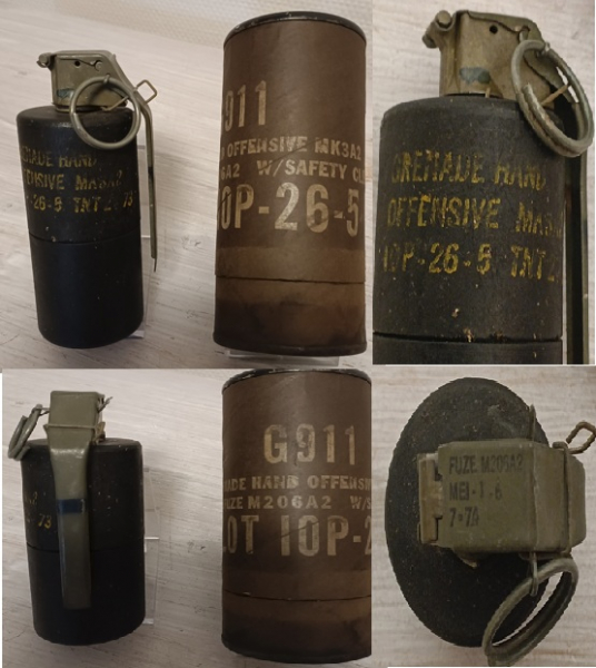 Die Oberseite hat in der Mitte eine direkt eingeschraubte Zündkapsel der M206A2-Serie, die rauch- und geräuschlos brannte und eine Verzögerung von fünf Sekunden hatte. Sie enthielt eine ca. 226,8 Gramm TNT-Ladung. Die Granaten wogen ca. 435 Gramm.