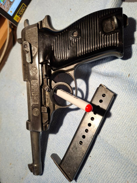 ME 38 P / Kaliber: 8 mm K / Munition: Gas- und Platzpatronen / Kapazität: Magazin für 10 Patronen / Daten: Länge 213 mm; Höhe 139 mm; Breite 34 mm; Gewicht 1.055 g / Brünierung: Schwarz / Abzug: Erster Schuss Single-Action, weitere Schüsse Double-Aktion / Laufsperre: Nach etwa 10 mm einwärts sichtbar / Zerlegung: Magazin entnehmen; Griffschalen abnehmen; Hinweise: Insgesamt ein äußerlich gut gemachter Nachbau der "Walther P38". Man sieht alle Bedienteile, doch haben diese teilweise andere oder keine Funktionen, z.B. ist der Sicherungshebel ohne Funktion und der Schlittenfanghebel hat die Funktion des Sicherungshebels. / Kein weiteres Zubehör. Stempelungen linke Seite: Hersteller-Emblem; ME 38 P; CAL 8 mm K; MADE IN ITALY; PTB 475 / Stempelungen, für Silvester geeignet, Pyrobecher bei e Gun günstig zu erwerben.