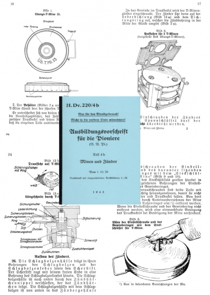 gebundener Nachdruck der Wehrmacht Dienstvorschrift für Pioniere H.Dv.220/4b: Minen und Zünder von 1943. A6 Format. Viele Abbildungen. Auf 198 Seiten werden folgende Themen behandelt:
