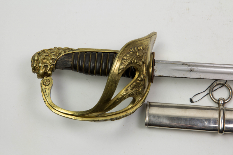 Säbel, Frankreich, M 1923, Säbel für höhere Offiziere, vergoldeter Bronzegefäß mit Löwenkopfabschluss, ausgebrochener Horngriff, Klinge graviert: Couleaux et Cie à Klingenthal,vernickelte Scheide, ca. 14 cm zu lang, Gebrauchsspuren. L: 104 cm.