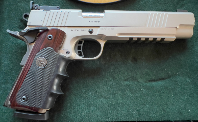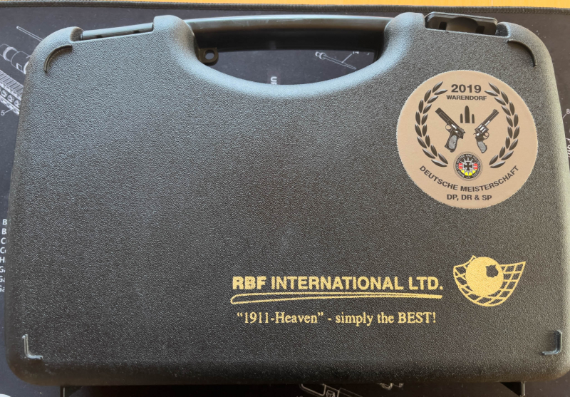 Angeboten wird eine Pistole RBF Super Match MK V in 9mm Luger mit 6“ Lauf in einem sehr guten Zustand. Der Lauf ist RBF-üblich konisch ausgeführt, was bedeutet, dass auf die Laufführungsbuchse verzichtet werden kann. Die Waffe wurde nachträglich mit Pachmayr-Griffschalen versehen, die Original-Griffschalen werden beigelegt. Die Waffe wird mit zwei Magazinen und Koffer mit Schloss verkauft.