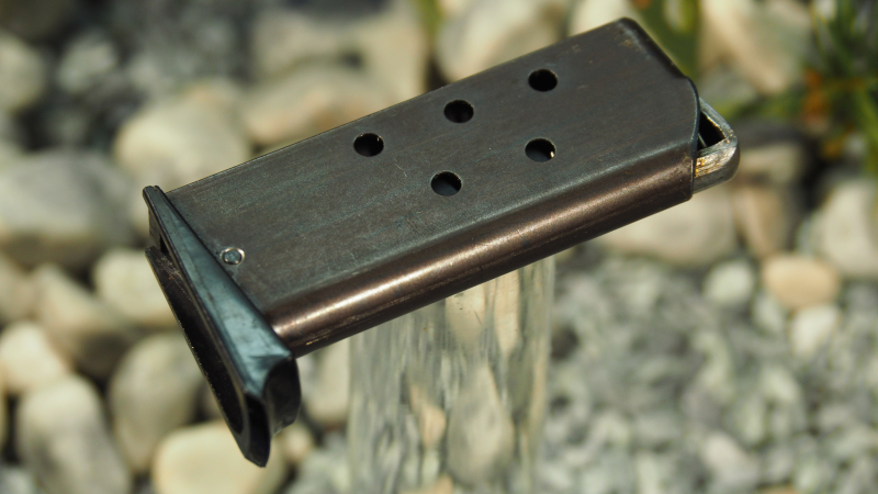 Sehr gut erhaltenes Magazin für die Rhöner Sportwaffen SM 110 Signalpistole. Das Magazin ist ohne Mängel und augenscheinlich unbenutzt ! Es fast 6 Patronen vom Kaliber 8mm Knall !