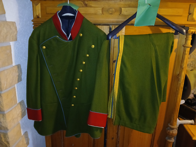 Rock und Hose wohl für höheren Forstbeamten oder Jäger, wohl ende 19. Anfang 20. Jhd, Größe geschätzt Bund ca 67 cm Durchmesser, Hosenbein Länge ca 110 cm, Rock Schulterbreite ca 55 cm