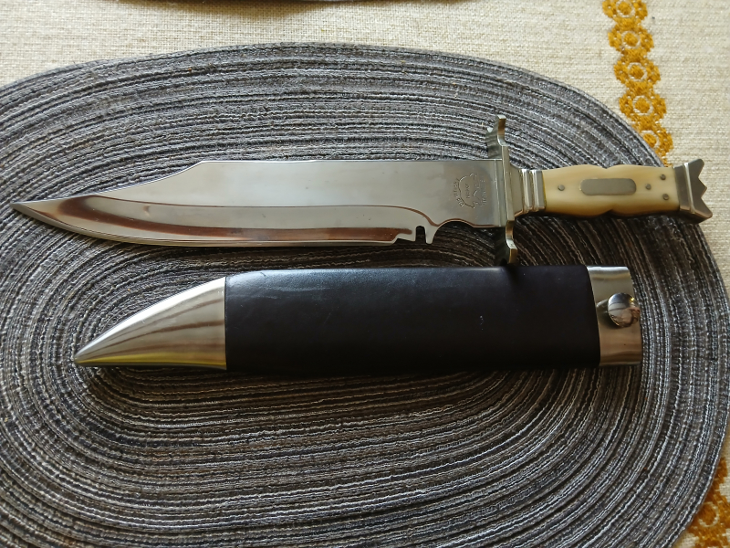 Seltenes Bowie Messer gefertigt in den wohl 1970er oder 1980er Jahren, vom bekannten Messermacher Wysniewski alias Old Whiskey, er baute nach Original Vorlagen eine geringe Zahl von Bowie Messern, Zustand gut. Seltene Gelegenheit solch ein Messer zu ersteigern.