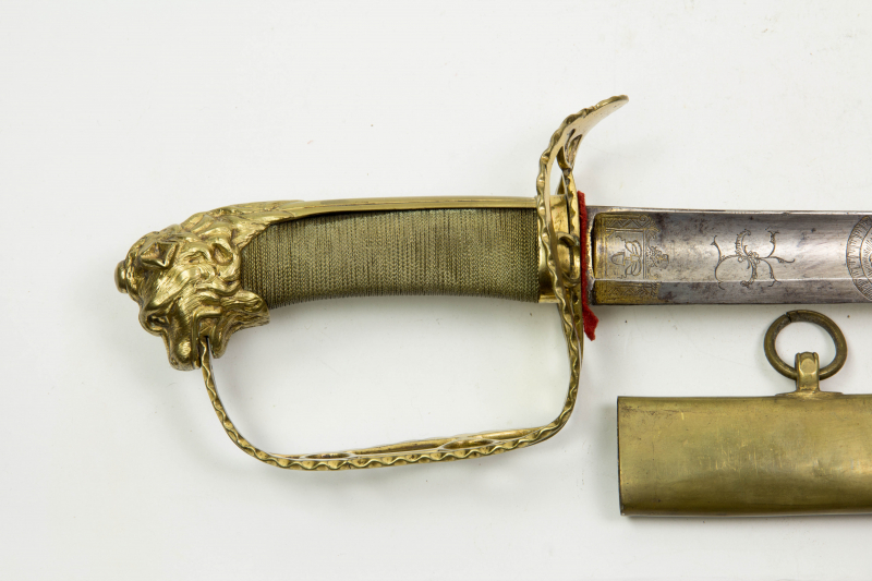 Löwenkopf-Säbel, Frankreich, Ende 18. Jh., Revolution, Offizier, stark vergoldetes, etwas deformiertes Messinggefäß, Griffstück mit Silberdrahtwicklung, Klinge mit minimalen Resten einer Bläuung, beidseitig mit Freimaurer Symbolen der Zeit verziert, Lederscheide mit Messingbeschlägen, ein Säbel dieser Art ist äußerst selten, Gebrauchsspuren. L: 98 cm.