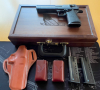 Angeboten wird eine halbaut. Pistole Desert Eagle aus Original IMI Fertigung im Kaliber .44 Mag mit zwei Magazinen. Die Waffe wurde im vergangenen Jahr auf starre Original-Visierung umgebaut und vom Büchsenmacher durchgesehen. Damit entspricht sie den Regularien z.B. als Dienstpistole beim BDMP. Für den Umbau auf andere Wettbewerbe erhält der Käufer 3 verschieden dicke Holzgriffschalen (Magnum Research) eine LPA-Visierung, Waffen und Magazin-Holster aus Leder alles im MR-Holzkoffer mit Zahlenschloss