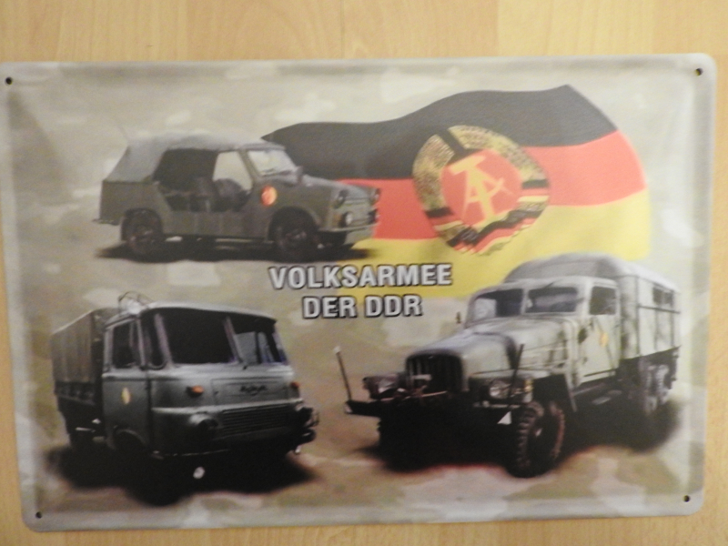 Biete Blech-Dekorationsschild mit Abbildungen von ausgewählten Fahrzeugen der NVA der ehemaligen DDR. Die Abmessungen sind 30 cm x20 cm. an allen vier Ecken befinden sich Bohrungen zur Befestigung. Das Schild ist wahrscheinlich im Siebdruckverfahren hergestellt Herkunft sowie Alter sind mir unbekannt.