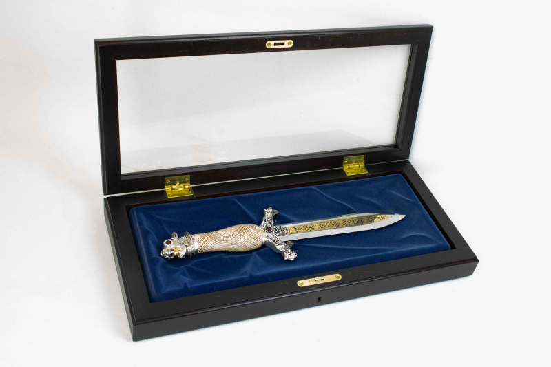 Hier ein schönes Weihnachtsgeschenk, eine Sammler Anfertigung von Franklin Mint im top Zustand. Ein prächtiger Wikingerdolch für Sammler ein tolles Vitrinenstück aus einer Sammlung, leider ohne Kassette und Kaufbeleg nur so wie auf dem dritten und vierten Bild abgebildet entspricht 1zu 1 dem ersten Bild, bekomme mit meiner alten Kamera keine besseren Bilder hin.Der mächtige Dolch ist etwa 390 mm lang wiegt etwa 670 Gramm Die Klinge ist an der breitesten Stelle etwa 37 mm breit.