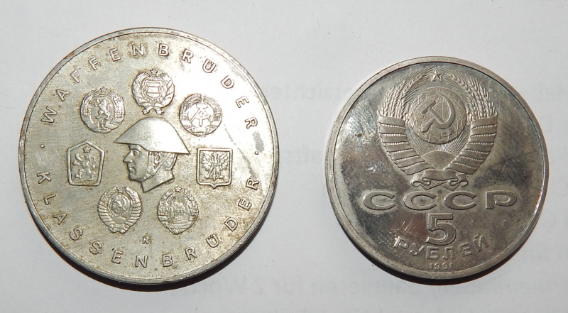 2) DDR "Waffenbrüder - Klassenbrüder" 1980, Material: vermutlich Kupfer + Nickel (nicht magnetisch), Durchm.: 40 mm.