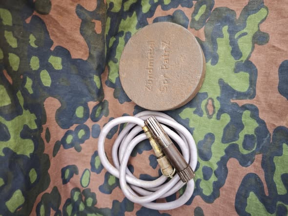 Enthält ein originales Wehrmachts-Zündkabel mit beidseitigen Anschlusssteckern sowie einem inerten elektrischen Anzünder. Die Stecker sind sauber erhalten: Bakelitgehäuse mit Rändelung, Metallkontakte und originale Isolation.