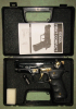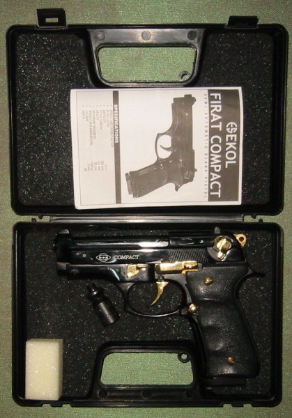 Es steht eine Ekol Firat Compact Pistole zum Verkauf. 9mm PAK. 15-Schuß-Magazin. Vermutlich selten in schwarz-goldener Ausführung.