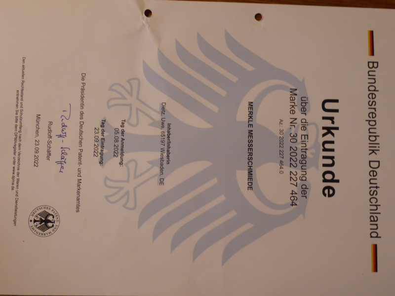Neben der Hauptklasse 08, bei der wir umfassend die Marke für alle Arten von Blankwaffen gesichert haben. Wurde außerdem die Klassen 18, 22 und 25 für die Wortmarke registriert -