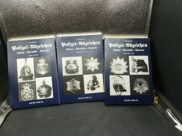 E.Radecke ,,Polizei-Abzeichen Band 1-3",Helme,-Heraldik-Historie, Band 1 - 1918, Band 2 1918-1945, Band 3 1945-1993. 620 Seiten reich bebildert Soldi-Verlag