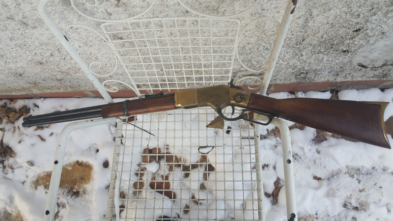 Winchester 1866 Deko. Die beiden Schrauben die den Schaft hinten heben fehlen. Der Unterhebel schwingt locker hin und her. Länge ca. 1 Meter