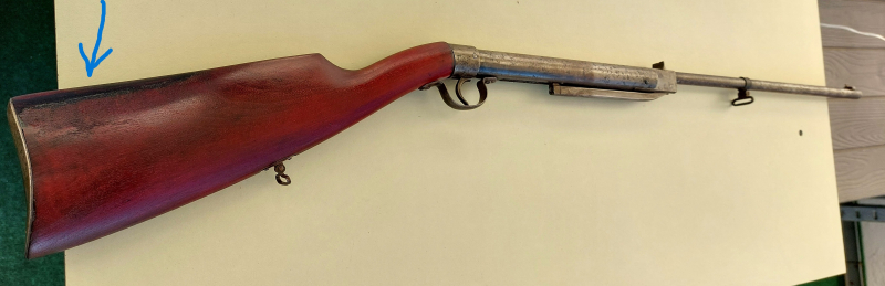 Der Holzschaft hat oberhalb eine Beschädigung die 10cm lang, ab der Schaftkappe entlang geht,siehe Bild.Wie es aussieht wurde dort mal ein Stück Holz ein-geleimt.Sieht so aus,als war das mal ein Brandschaden.Man hätte es vielleicht besser hinkriegen können. Das System hat keine Brühnierung mehr,ist auch nicht mehr so glatt.Der Lauf ist gezogen und der Druck ist für dieses kleine Gewehr sehr ordentlich.Habe mit geschossen,auf 5m Entfernung gutes Trefferbild. Ob die Riemenhalterungen Original sind,kann ich nicht sagen. Leider ist die Geschichte des etwa 90 Jahre alten Gewehrs mir nicht bekannt. Wenn aber trotzdem Interesse besteht schicke ich gerne ausreichen Bildmaterial und werde versuchen eventuellen Fragen so gut ich kann,zu beantworten.
