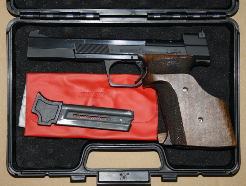 Aus gepflegtem Erstbesitz stammt diese Hämmerli 208 im Kal. .22lfb. Sie kommt im Koffer mit dem abgebildeten Zubehör. Schöner Zustand, Lauf und Funktion einwandfrei.