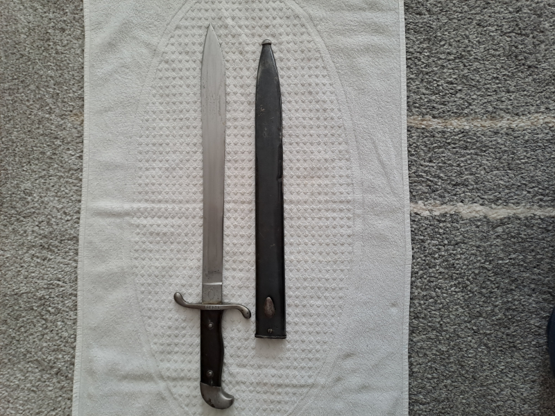 Biete aus einer Sammlung eine Weyersberg ,Kirchbaum Solingen Machete Argentino 1909 an. Diese ist Nummerngleich mit der Scheide ( DO 4928). Gesamtlänge ist 50 cm und die Klinge ist 35 cm bis zur Fehlschärfe. Leichte Gebrauchsspuren und Alterspatina.