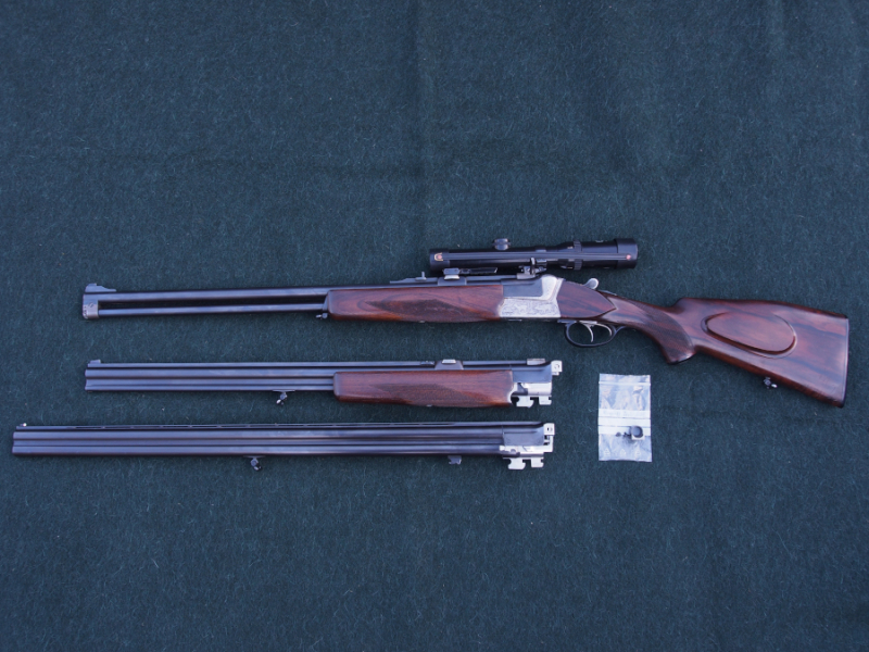 Selten geführte Krieghoff-Teck Safari-Kombination in Luxus-Ausführung in den Kalibern: BDB 9,3X74R Thermostabil, BBF 7X65R/16-70; BDF 16-70. BDB und BBF-Lauf mit EAW-Basen. Zustand: Ausgesuchtes Schaftholz, fein geschnittene Fischhaut, schöne Tierstückgravuren, Läufe innen wie neu, Verschluß stramm mit allen Läufen, äußerlich minimale Gebrauchspuren. BDB und BDF- Lauf mit Ejektor; wenn man will, kann man auch den BBF-Lauf mit den Ejektoren versehen. Der vordere Abzug funktioniert auch als Einabzug, unabhängig vom Rückstoß, also auch bei Versager oder für Präzisionsschuß aus dem oberen Lauf, z.B. beim Einschießen der BDB oder EL bei der BBF, nach vorherigem Abschlagen auf leere Hülse oder Pufferpatrone im unteren Lauf. Die thermostabilen BDB-Läufe sind per im Schwalbenschwanz geführte auswechselbare, seitlich und in der Höhe verstellbare, Verstelleinrichtung an der Mündung einregulierbar. Als ich das Gewehr bekam, war es auf 18,5Gramm-Geschosse einreguliert, und ich konnte damit nicht meine 250grain-Geschosse zum Zusammenschießen auf 100m bringen. Nach Rücksprache mit Krieghoff erhielt ich eine für leichtere Geschosse vorgesehene, mit der ich die Läufe mit meinen Laborierungen (250grs (16,2g) Swift A-Frame und Barnes TTSX sowie neuerdings 220grs (14,3g) Fox) auf 100m bis auf 3cm zusammenbringe. Die Verstelleinrichtung für schwerere Geschosse ist Bestandteil des Angebots; Foto passte nicht mehr in die Galerie; wird auf Wunsch gern nachgereicht. Das mit abgebildete ZF Schmidt&Bender 1,25-4X20, Abs.2 nebst daran angebrachten Montageteilen ist nicht Bestandteil des Angebots, kann aber für 300€ vom erfolgreichen Höchstbieter mit erworben werden. Das Gewehr kann nach Absprache gern besichtigt werden. Verkauf nur an EWB und nur innerhalb Deutschland. Bei besonderem Interesse aus dem Ausland: fragen vor dem Bieten. Versandkosten gelten nur für Versand innerhalb Deutschland; ansonsten: fragen. Selbstabholung ist mir lieber als Versand. Verkauf von Privat, ohne Gewähr, Garantie, Nachbesserung, Minderung, Rücknahme; das zu akzeptieren ist Voraussetzung, um auf dies Angebot zu bieten.