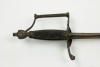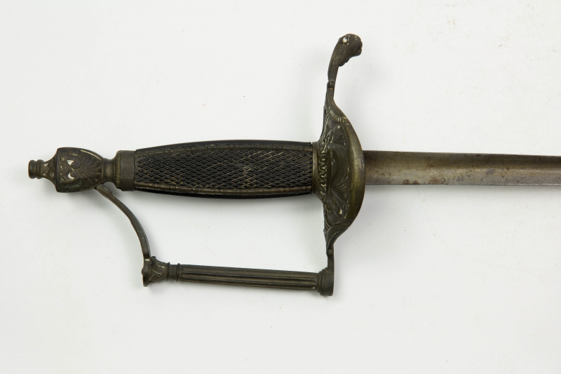 Degen, Frankreich, Consulat, Marine, vor 1804, Bronzegefäß, halbrundes Stichblatt mit auf Anker sitzender Aphrodite auf Nordstern zeigend, Griffbügel in Form einer griechischen Säule mit Kapitell in urnenförmigen, flachgedrückten Knauf endend, Knauf beidseitig graviert mit Ornamenten, Lektorenbündeln, Kriegstrophäen und Helm verziert, geriffeltes Ebenholz-Griffstück mit Perlstabkanten aus Bronze, spätere Dreikantklinge, Gefäßalter grüner Patina, Gebrauchsspuren, selten. L: 98 cm.