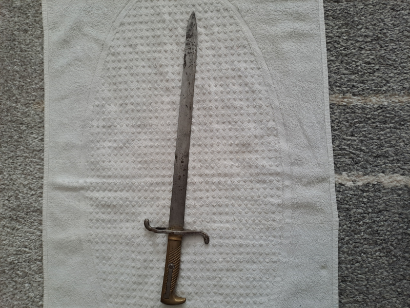 Biete aus Sammlung ein Seitengewehr vermutlich Preußen 1871 an. Die Klingenlänge beträgt 32,5 cm und die Gesamtläng ist 43 cm. Die Parierstange hat leichtes Spiel, ansonsten mit Alterspatina, aber keine Rostnarben, leicht fleckig.