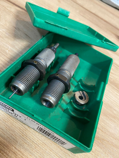 Zur Auktion kommt der abgebildete RCBS Matrizesatz in 7,62 russisch, inklusive des dazugehörenden Hülsenhalters.