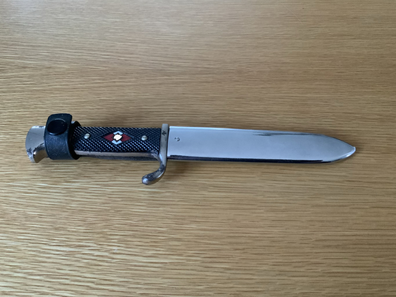 Leider etwas fleckig, die Scheide ist vernickelt, das Emblem im Griff ist einwandfrei.