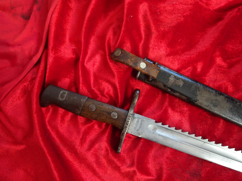 Sie bieten hier auf ein altes originales Bajonett mit Sägerückenklinge Schweiz, Hersteller Waffenfabrik Neuhausen kplt. mit Stahlscheide, für das Alter noch gut erhalten, Drücker funktioniert, sehr schönes gut erhaltenes Sammlerstück, garantiert alt und original, darauf gewähre ich uneingeschränktes Rückgaberecht, ebenso bei falscher Beschreibung, ansonsten da Privatverkauf keine Gewährsübernahme!