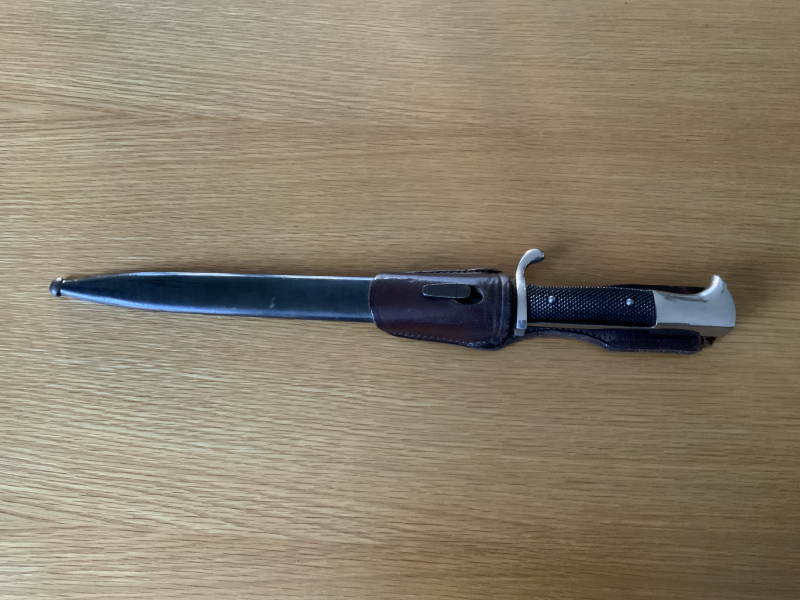 Ausgehbajonett Wehrmacht mit Klingenätzung, Hersteller P.D.LÜNESCHLOSS.SOLINGEN mit Ätzung „Erinnerung an meine Dienstzeit“ mit Luftwaffenader und Umseitig „Legion Condor“ mit Doppeldecker. Gesamtlänge 37cm mit Scheide und braunem Koppelschuh.