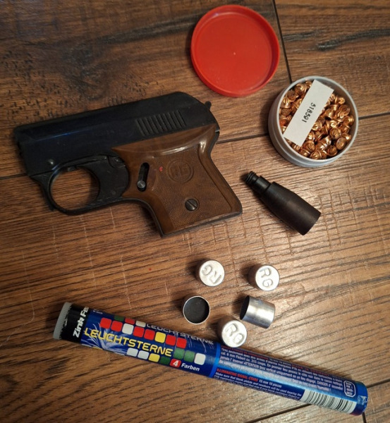 Verkaufe aus Nachlass eine kleine Pistole der Marke Röhm Mod. RG 3-S. Kompl.mit Zubehör( Abschussbecher, Leuchtraketen und 1Packung Platzpatronen).Noch die alte Ausführung... s. Schriftzug auf der rechten Seite. Alles weitere s. Fotos. Privatverkauf keine Garantie oder Rücknahme, bieten Sie bitte nur wenn Sie damit auch einverstanden sind. Portokosten nur für Deutschland u. Österreich gültig, andere Länder auf Anfrage.