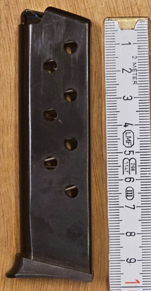 Verkaufe hier das abgebildete Magazin. Es ist leicht gebraucht. Keine Ahnung, von welcher Pistole es stammt. Kaliber ist wahrscheinlich 7,65mm Browning. Als sehr auffälliges Merkmal verfügt es über einen separaten Hebel für den Verschlußfang, der bei leerem Magazin nach oben und etwas nach aussen gedrückt wird. Eine passende Waffe habe ich nicht im Bestand. Vielleicht weiß jemand, für welche Pistole es ist?