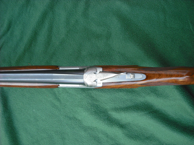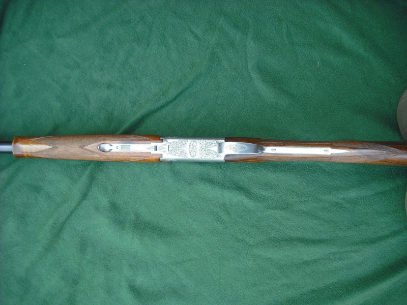 Kal. 12/70. Gesamtlänge ca. 113 cm, Lauflänge ca. 70 cm, Abzug bis Schaftende ca. 36,5 cm. Laufschiene verjüngt sich von ca. 6,5 auf ca. 4,5 mm. Rotes Leuchtkorn. Schaft mit Edelholz verlängert. Mit Gummischaftkappe. Riemenbügel. Halb- und Vollchoke. Ca. 3,15 kg.