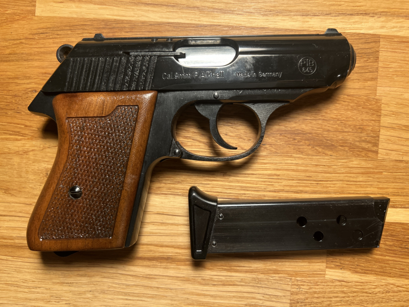 Zur Auktion steht eine Erma EGP 790 Schreckschusspistole mit Holzgriffschalen inkl. nummerngleichem Originalkarton und sämtlichem Zubehör, das auf den Fotos zu erkennen ist. Der Zustand ist wirklich sehr schön – es gibt aus meiner Sicht keine Schäden in der Oberflächenbeschichtung – allenfalls geringfügigste Lagerspuren.