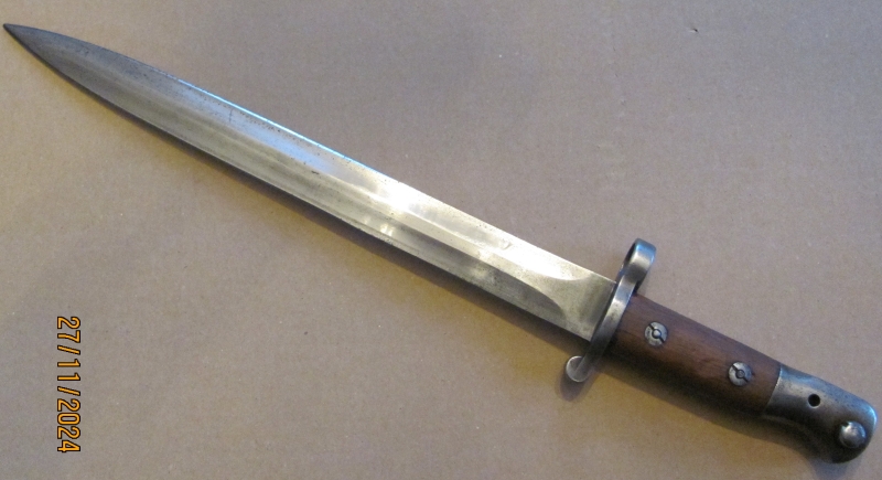 Seltenes Parade Bajonett M 1903 für SMLE Lee Enfield No1 Mk III der königlich afghanischen Armee / Emirat Kabul von Wilkinson London gestempelt/proofmarkiert mit Königskrone / 49W / Wilkinson London, hergestellt für den Vertrag der königlichen afghanischen Armee mit Inschrift in Dari-Schrift LAG2KT3B??3 / SHA?KL?T3?3 (Transkript unsicher) - siehe worldbayonets.com zur Referenz -- einige Anlaufstellen und ein Chip im Holzgriff, aber insgesamt guter bis sehr guter und originaler Zustand -