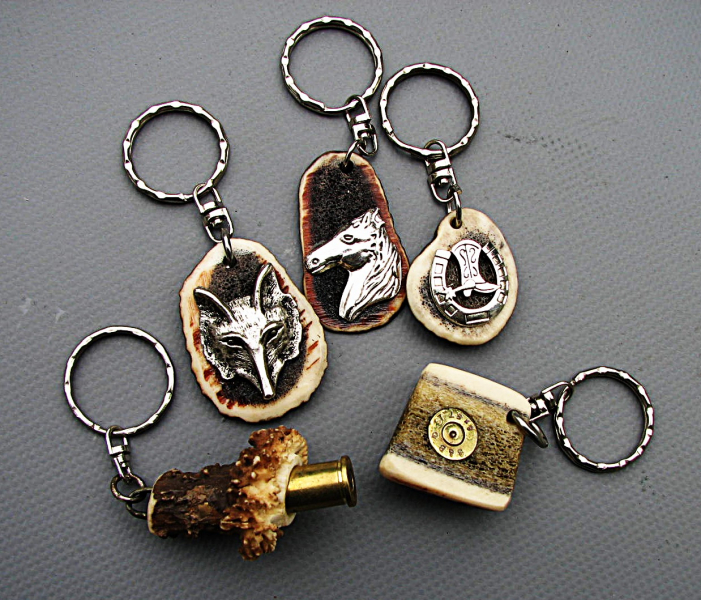 Hier 5 Schlüsselbund mit Anhänger, auf Hirschhornplatte. (Glücksbringer usw.) Pferd, Wolf, Stiefel, Hülse 357 Mag. Patronenboden 8x57 IS.