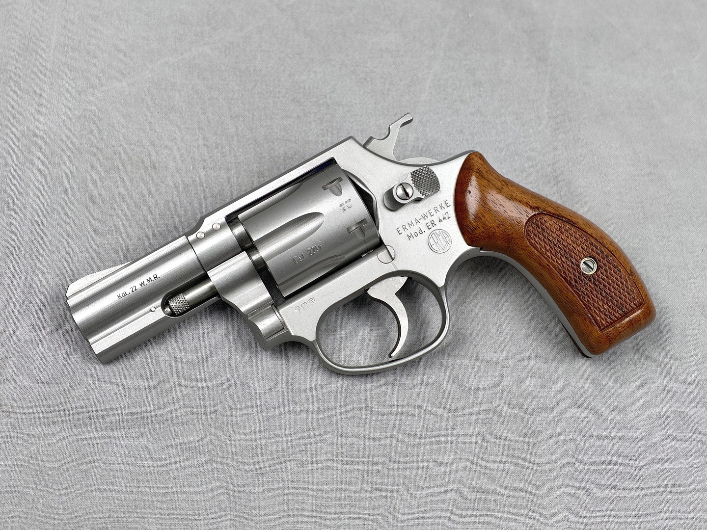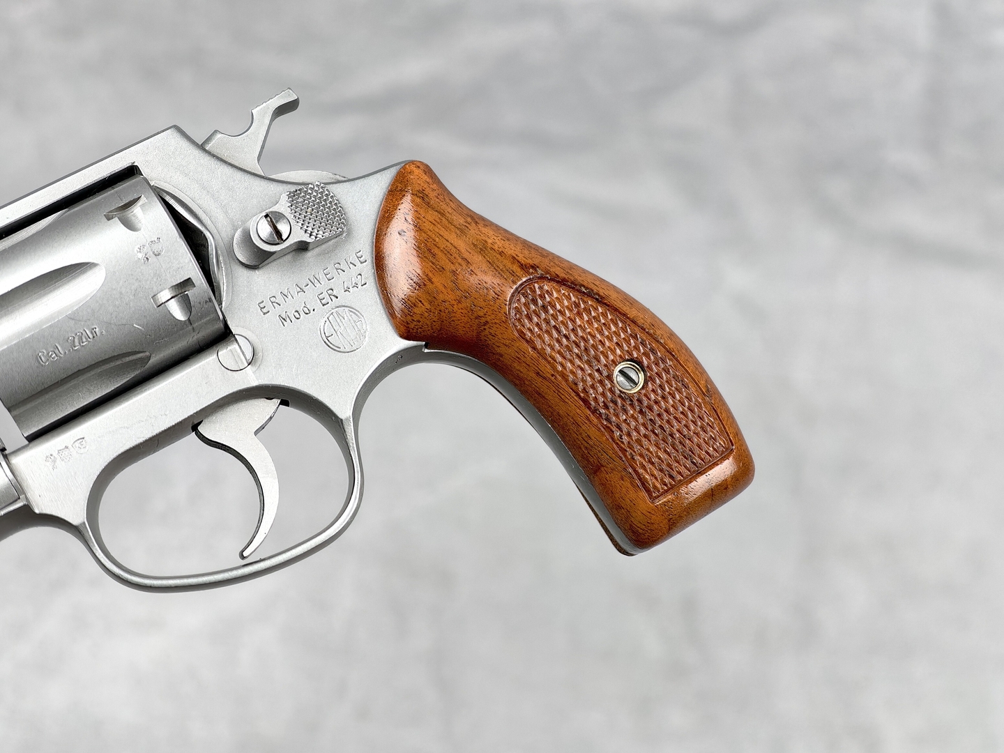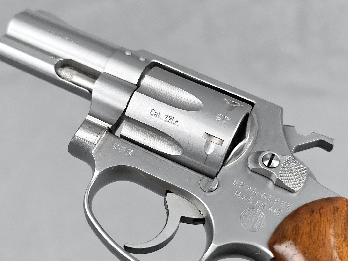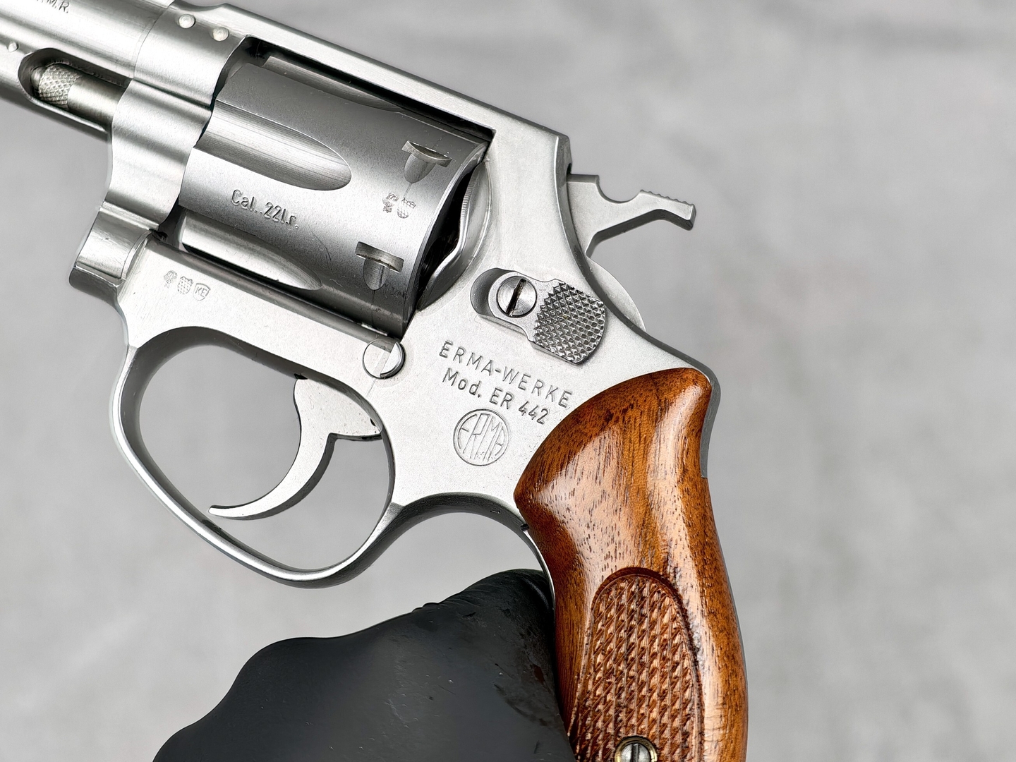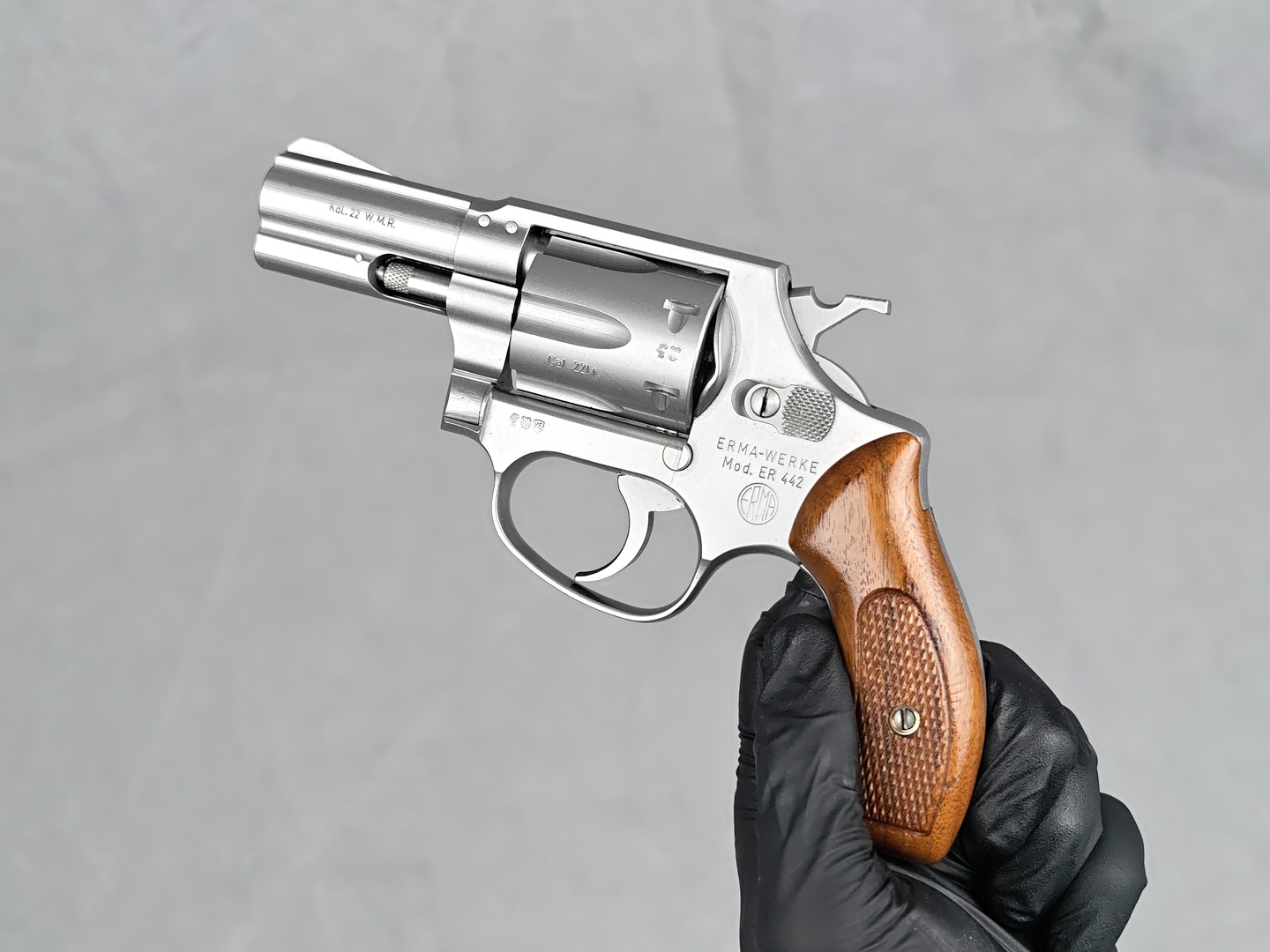 Der ERMA Modell ER 442 ist ein hochwertiger KK-Revolver aus deutscher Fertigung. Sein Design ist eng angelehnt an klassische GK-Modelle von Smith & Wesson, wie zum Beispiel an den S&W Model 12 in unserer anderen Auktion. Der Rahmen des Erma ist jedoch eine massive, spürbar hochwertige Vollstahlkonstruktion im zeitlos schönen Stainless-Finish.