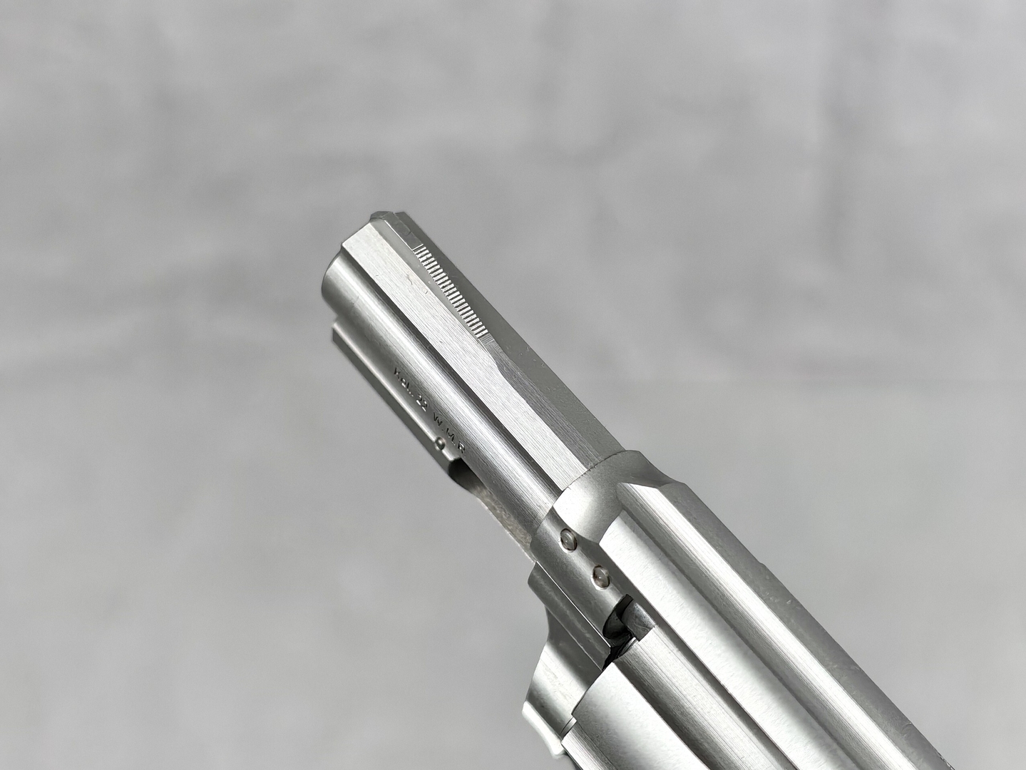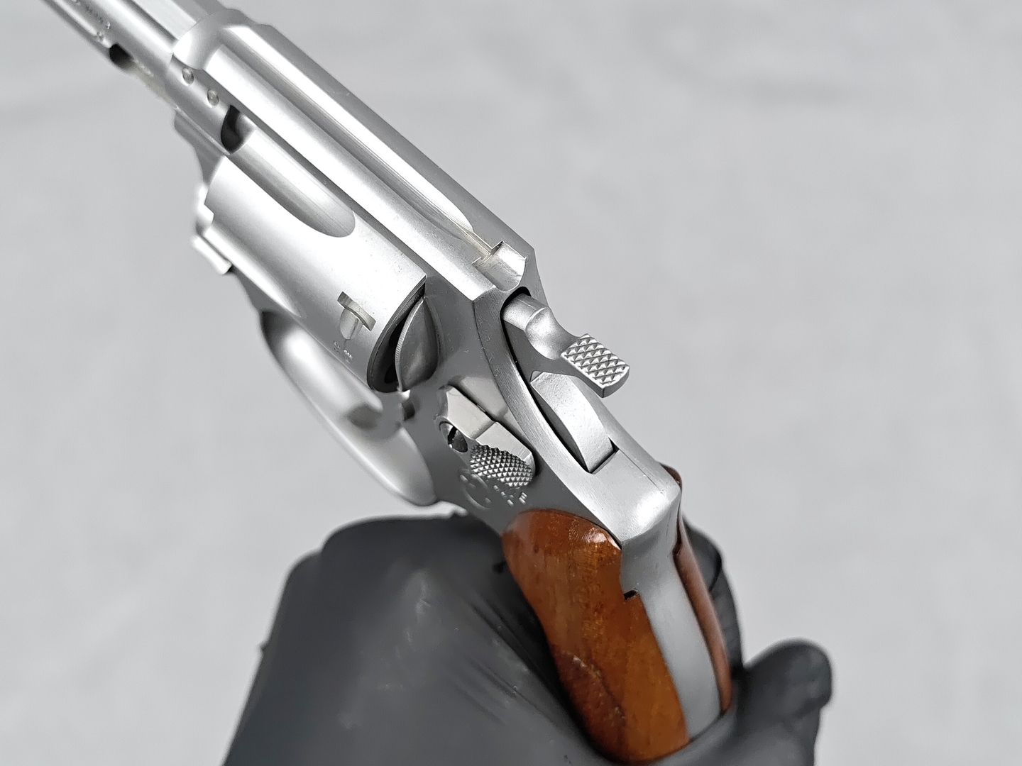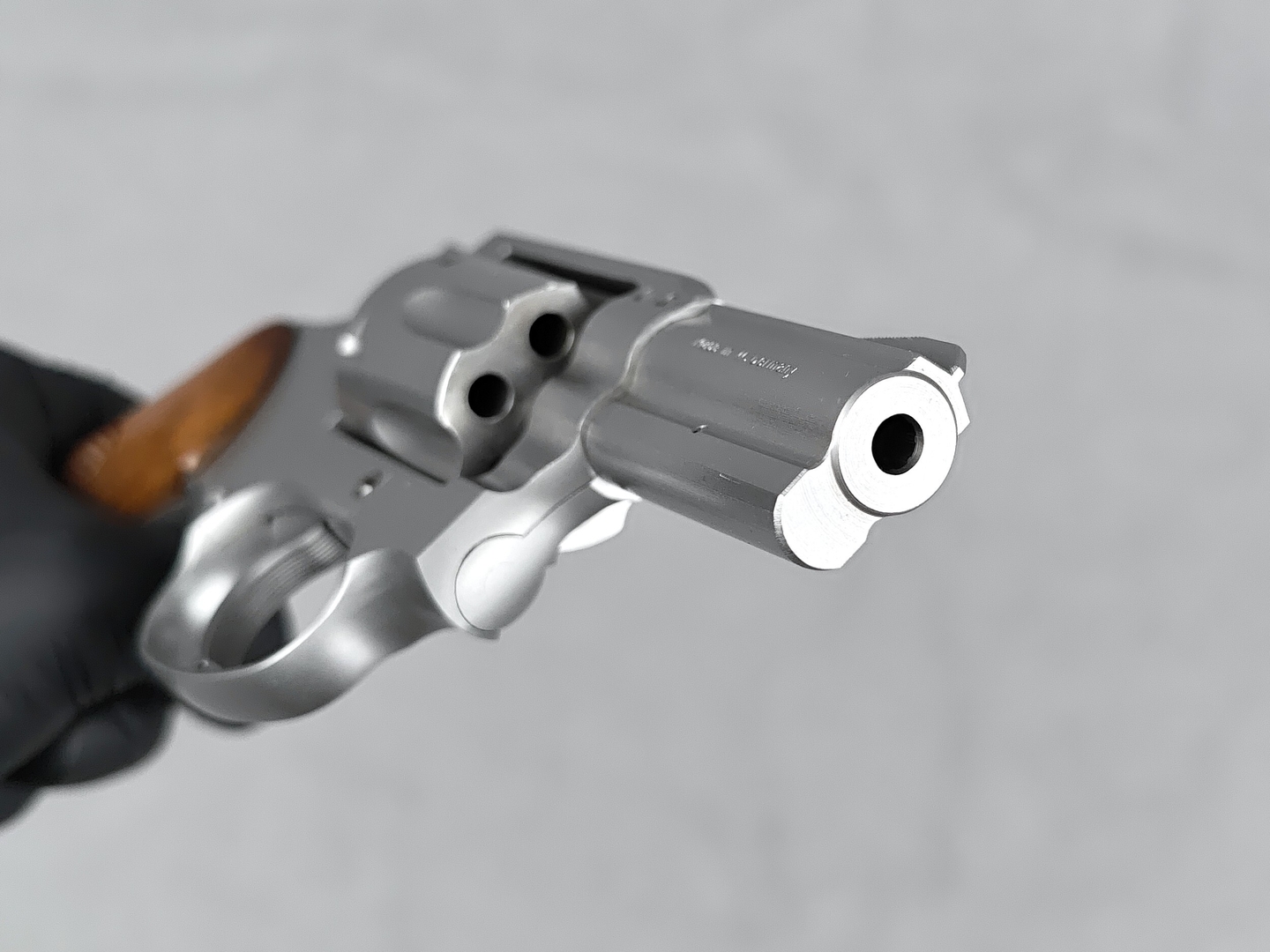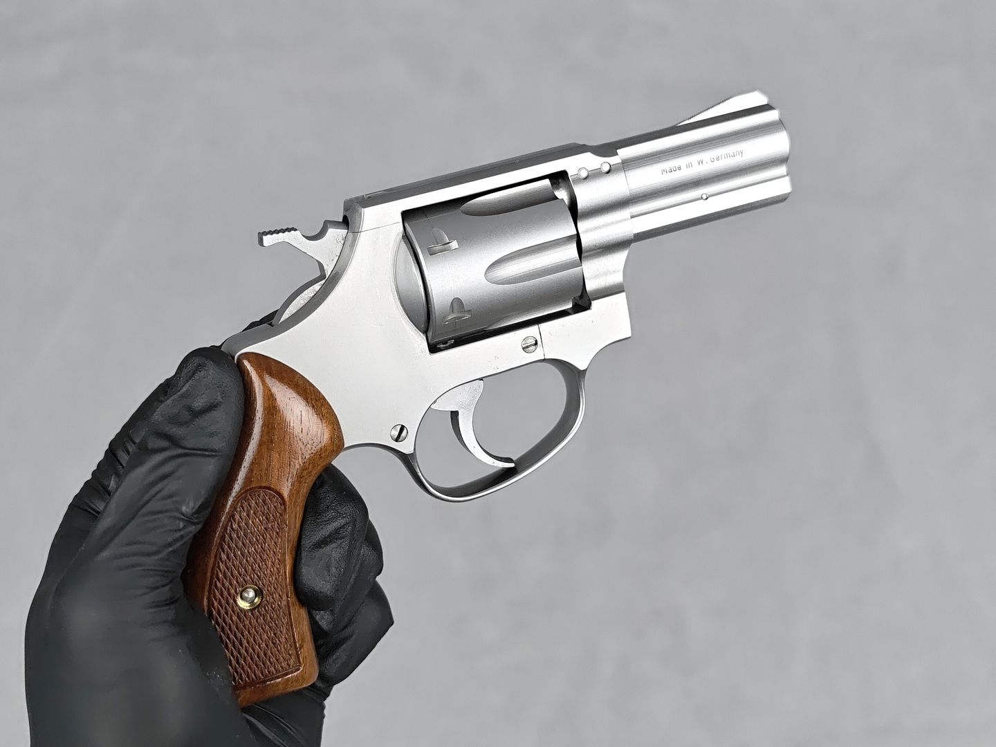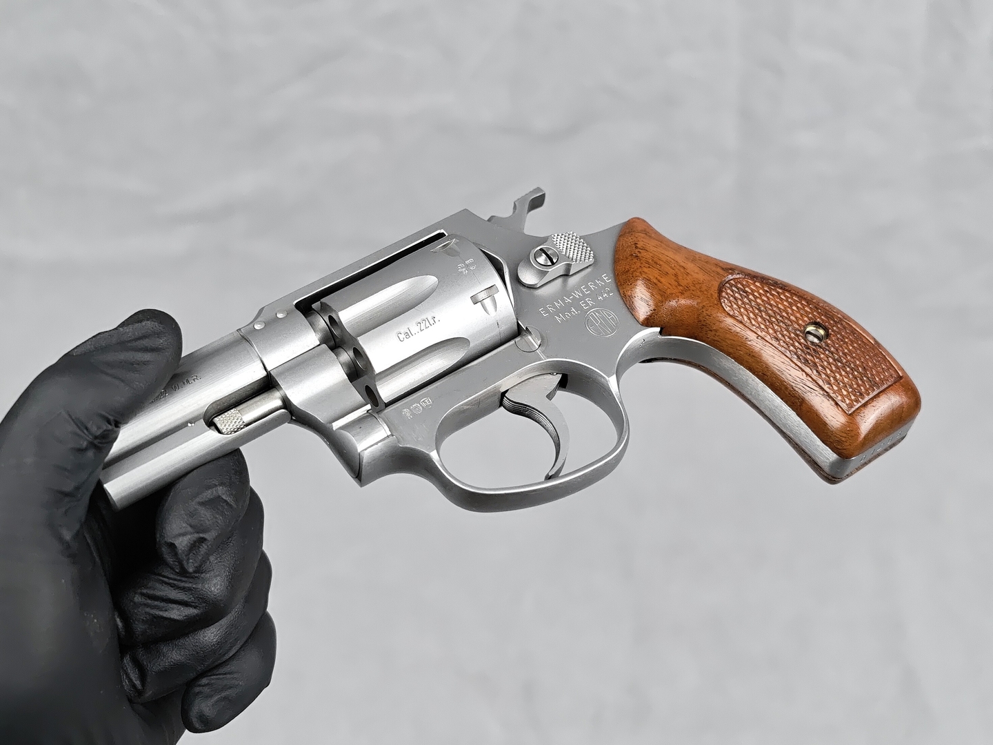 Der ERMA Modell ER 442 ist ein hochwertiger KK-Revolver aus deutscher Fertigung. Sein Design ist eng angelehnt an klassische GK-Modelle von Smith & Wesson, wie zum Beispiel an den S&W Model 12 in unserer anderen Auktion. Der Rahmen des Erma ist jedoch eine massive, spürbar hochwertige Vollstahlkonstruktion im zeitlos schönen Stainless-Finish.