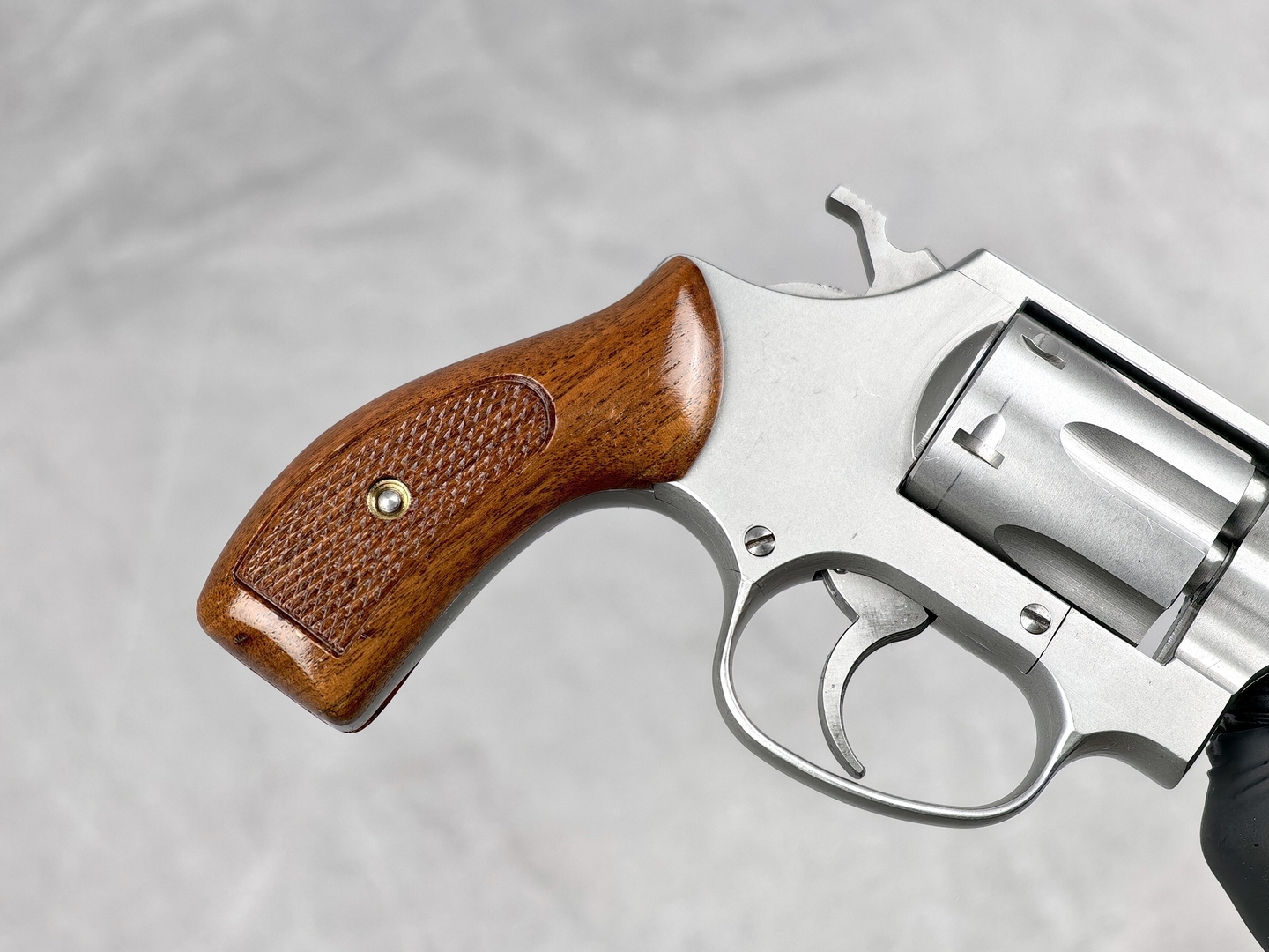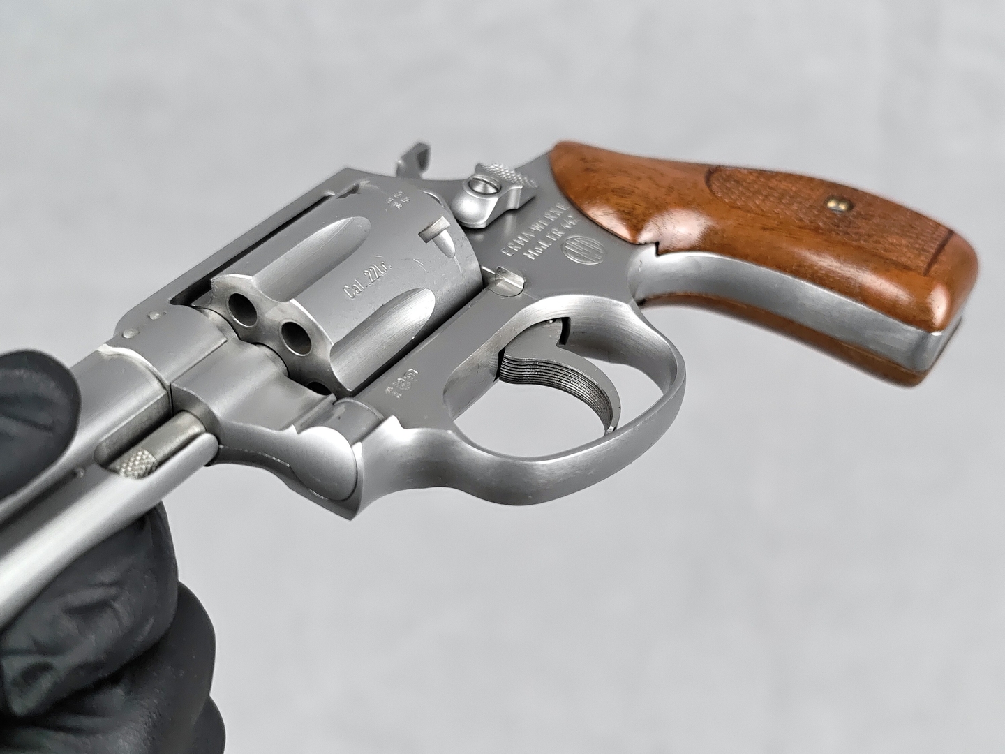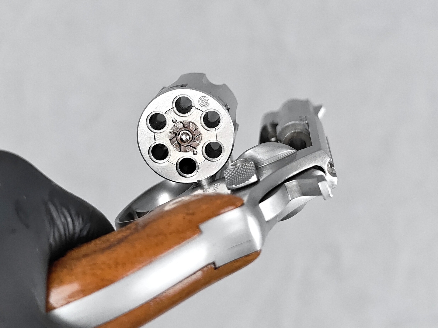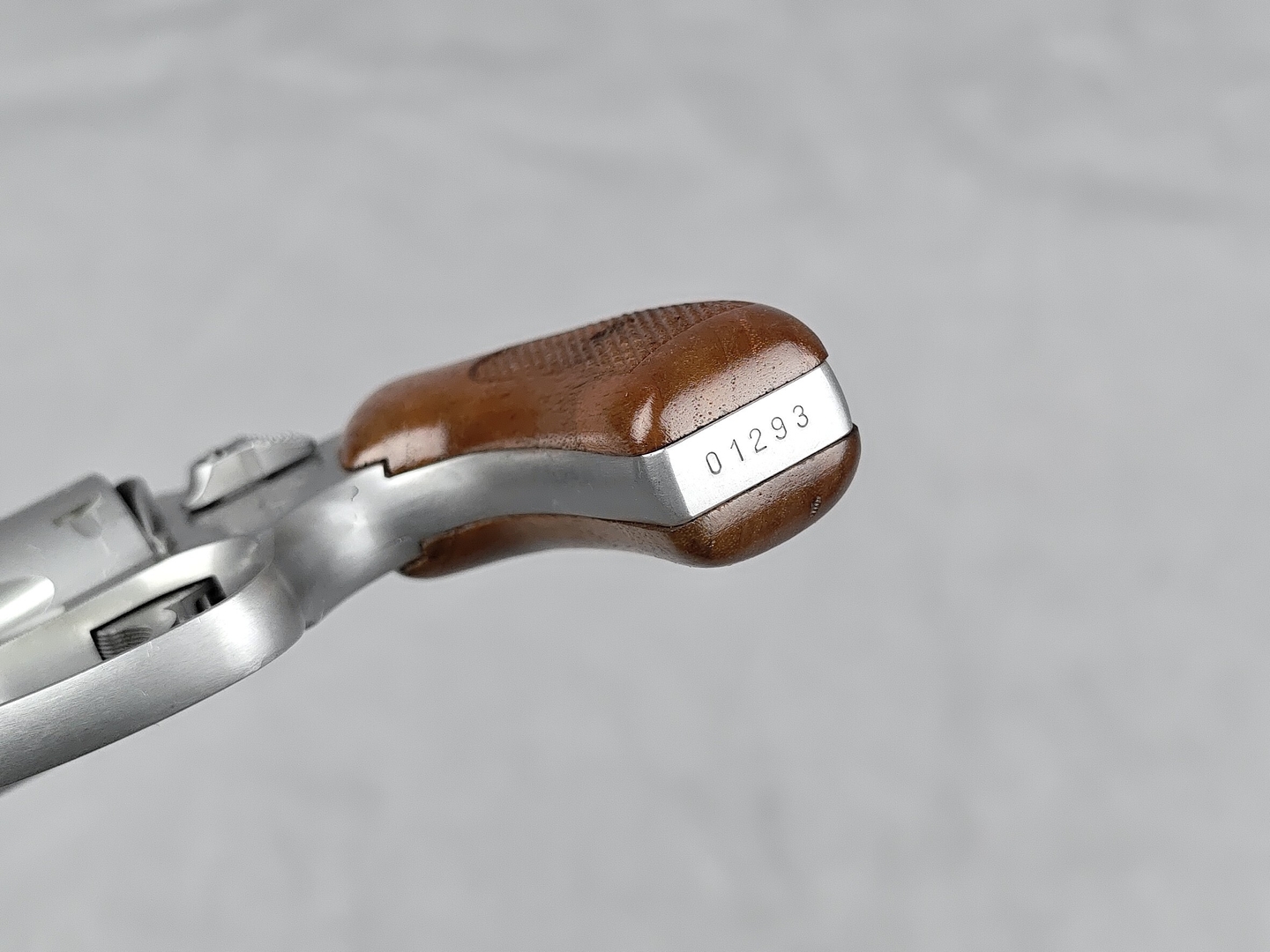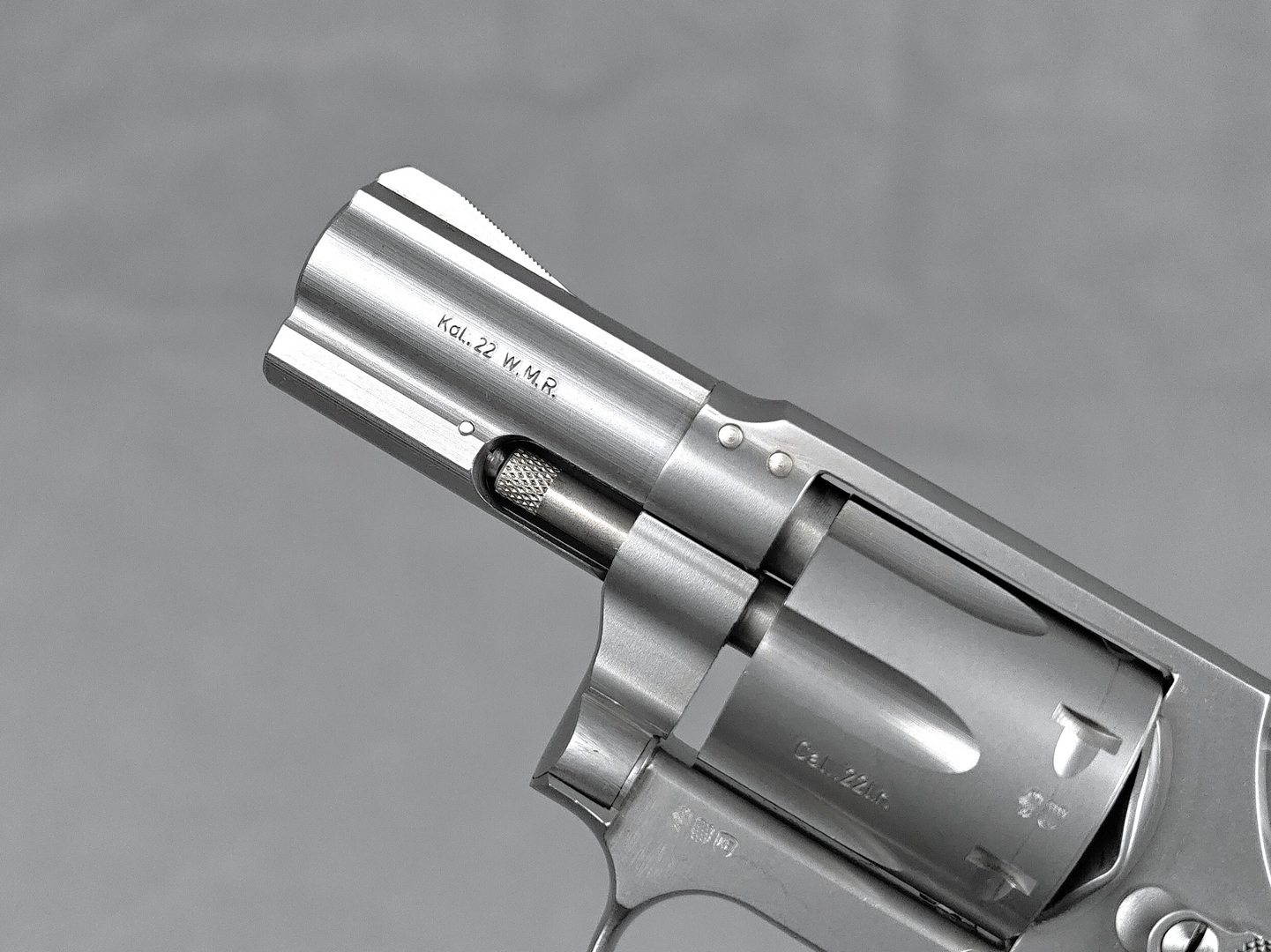 Zwar ist das Exemplar mit .22WMR gemarkt (und registriert), jedoch wurde offenbar nachträglich eine .22lr-Wechseltrommel verbaut (und als Zweitkaliber der Waffe registriert). Ob dies schon vor Auslieferung oder erst bei einem der Vorbesitzer erfolgt ist, entzieht sich leider unserer Kenntnis. Die .22WMR-Trommel ist nicht vorhanden. Aktuell handelt es sich also um einen Revolver im Kaliber .22lr.