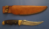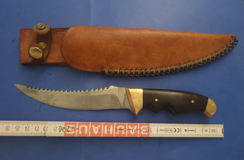 Messer hat eine schöne Skinner Form, mit eine Sägemuster oberhalb. Messergriff ist aus dunklem schweren Edelholz.