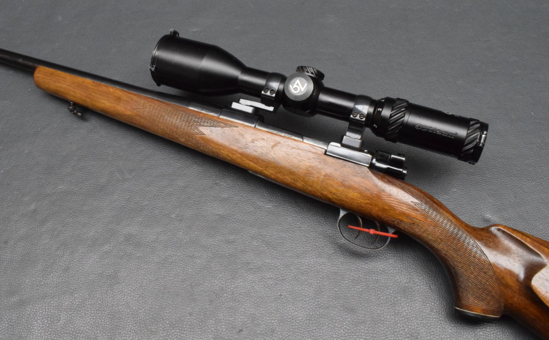 gebogener Kammerstängel, Stecher, 4-Schuß Magazinkasten. Montiert mit Zielfernrohr Optisan 2-12x50 Abs. 4 LP rot/grün, 30mm Ringen. Nußbaumschaft mit Backe, Schaftkappe & Riemenbügeln.