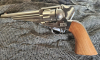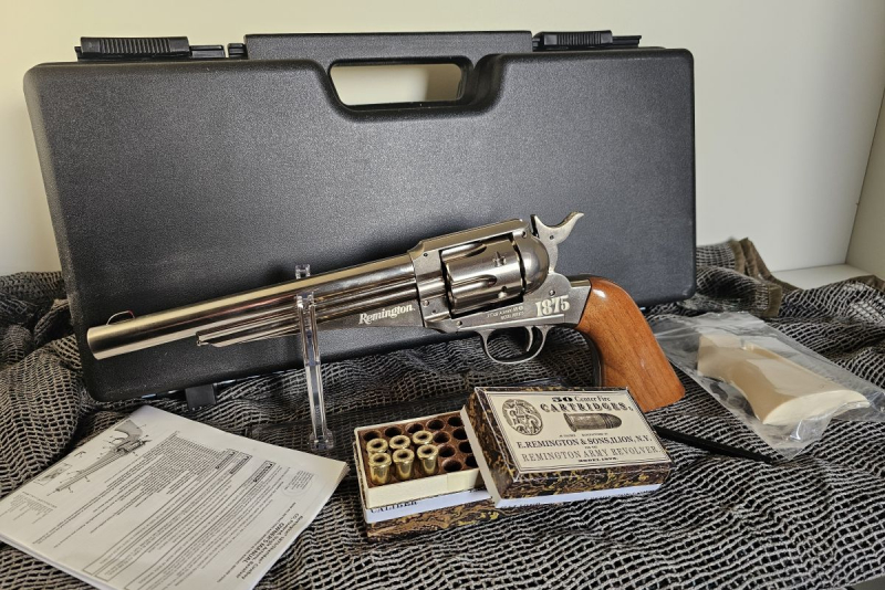 Remington 1875 Revolver. CO2 Antrieb (standard 12Gramm Kartusche im Griffstück). Artikelnummer: CR00224. Die Waffe kommt aus erster Hand, Sammlerstück. Sie hat Glattlauf und verschießt Rundkugeln oder Diabolos aus den zugehörigen Hülsen. Es sind jeweils 6 Hülsen für BB und Diabolos dabei. Vorne brüniert für authentisches Aussehen. Stylische Schachtel mit Holz-Inlay und passender Etikettierung für Remington Patronen. Die "Patronen" werden rechts bei offener Ladeklappe in die Trommel geladen bzw wieder entladen. Man kann BB`s oder Diabolos aber auch nachsetzen, indem man die Hülsen drinnen belässt. Hülsen-Ausstoßer funktionsfähig. Die Waffe ist Austellungsstück, ohne Kratzer und Macken und mit feinen Holzgriffschalen, die mit Schaftöl behandelt wurden. Auf dem Korn ein wenig roter Nagellack für bessere optische Zielerfassung (Leicht wieder zu entfernen). Die Dichtung stets mit Silikonöl gepflegt. Versendung erfolgt im Pistolenkoffer (in der sie auch geliefert wurde). Kunststoffgriffschalen, Bedienanleitung und Inbusschlüssel dabei.