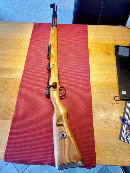 Karabiner K98 k, Hersteller Hege Baujahr 1941, Gesamtlänge 110 cm, Lauflänge 60 cm, Kaliber 8x57 IS, sehr guter Gesamtzustand und sehr schön und sauber überarbeitet, Lauf spiegelblank, Felder und Züge gut sichtbar, alle Waffenteile sind nummerngleich gestempelt, Schichtholzschaft, deutscher Beschuß aus dem Jahr 1969 mit Stempelung.