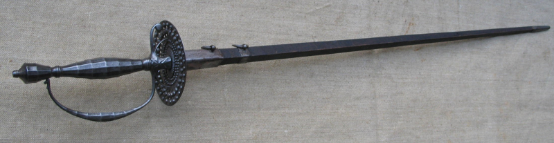 Gut erhaltener Gala – oder Galenteriedegen des 19.Jahrhunderts. Typisches Stück wie es zu gesellschaftlichen Anlässen oder als Trauerdegen getragen wurde. Eisernes Gefäß im Diamant-Fasettenschliff. Dreikantklinge sowie der oft fehlenden Scheide.