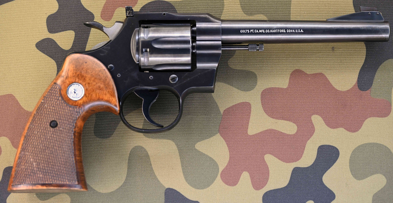 Tadellose originale COLT- Holzgriffschalen, wie beim großen Bruder Colt Python. An letzteren erinnert auch die wirklich schwere Qualität dieses Stücks.