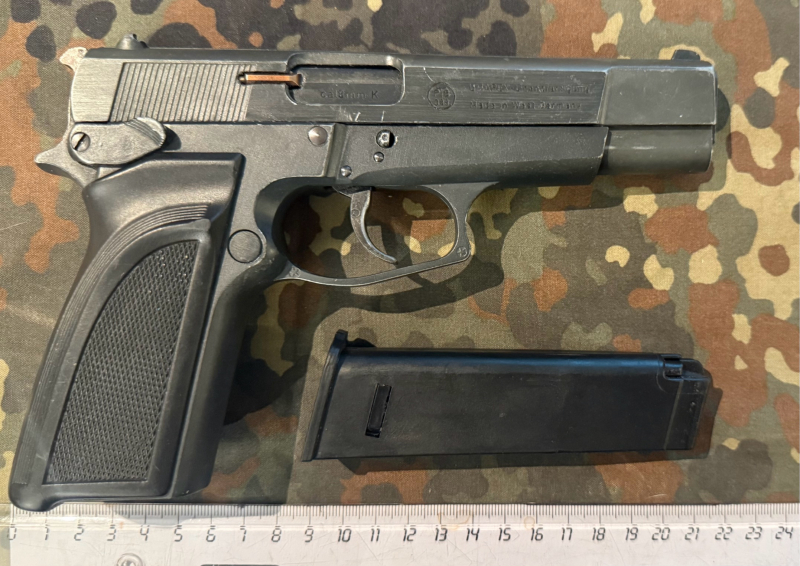 Pistole Browning Mod. GBDA 9 im Kaliber 9 mm P.A.K. Made in Germany! FN High Power Nachbildung. Kunststoffgriffschalen, PTB 389. Sie besitzt einen funktionierenden Schlittenfanghebel (nicht angedeutet, wie bei manchen Modellen). Gebrauchsspuren. Ohne weiteres Zubehör.