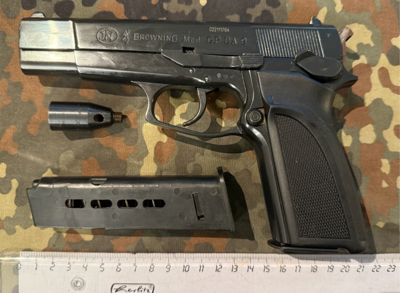 Pistole Browning Mod. GBDA 9 im Kaliber 9 mm P.A.K. Nachbau der FN High Power. Made in Germany! Kunststoffgriffschalen, PTB 592. Sie besitzt einen funktionierenden Schlittenfanghebel (nicht angedeutet, wie bei manchen Modellen). Minimale Gebrauchsspuren. Mit Abschussbecher für Pyromunition.